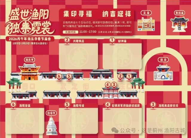 如果你还没有穿越过瘾,春节期间,渔阳古街根据蓟州古城地图设置6个古代街市互动点位,手持一张渔阳古城的打卡地图,就可以开始您的时光之旅。